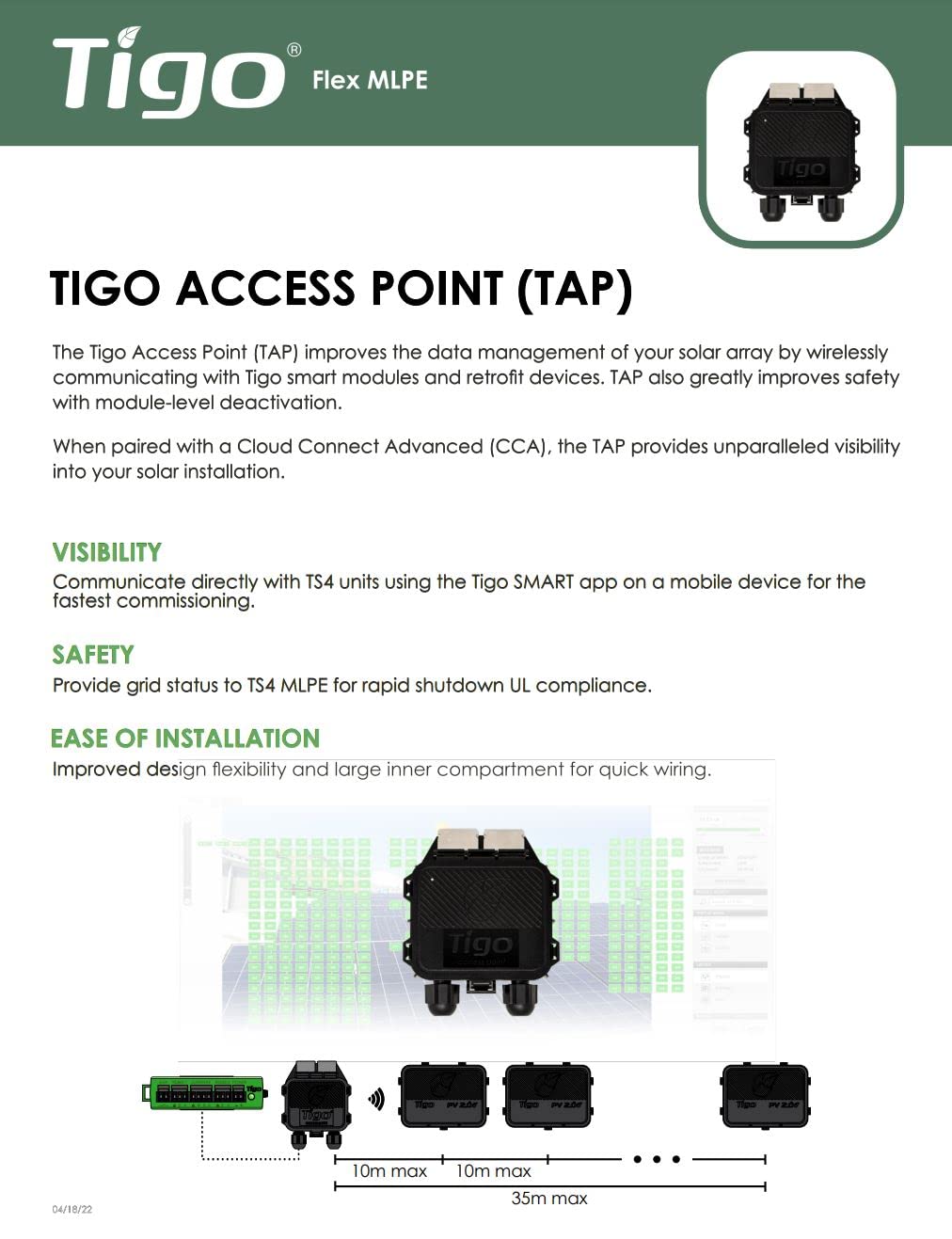 Tigo 158-00000-02 TAP Access Point Communication Device The Tigo Access Point (TAP) improves the data management of your solar system through seamless communication with Tigo Smart modules and retrofit devices. TAP significantly improves the level of security at module level deactivation. Combined with a Cloud Connect Advanced (CCA), the TAP offers unsurpassed insights into your PV system.