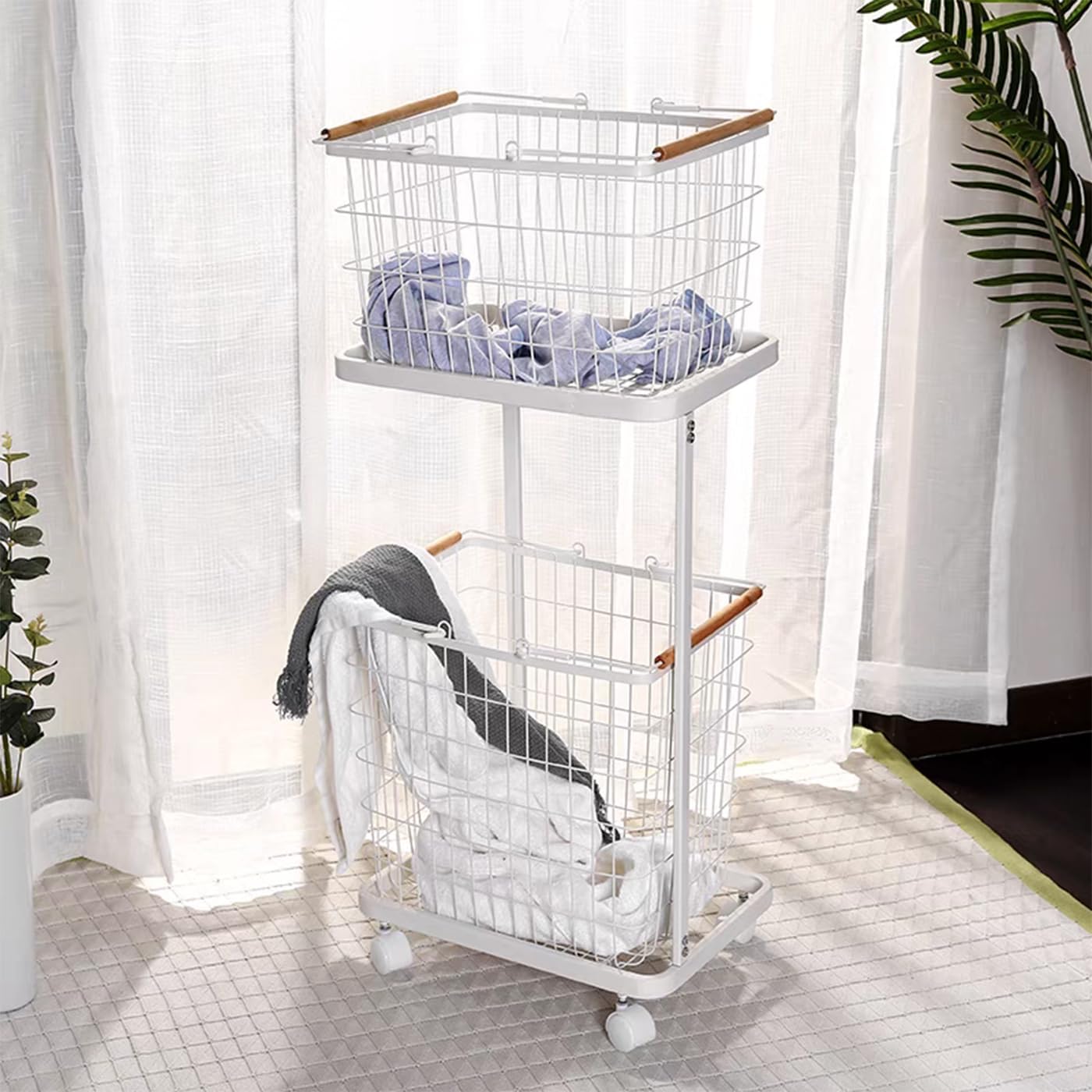 2 Tier Rolling Laundry Hamper with Removable Baskets, White Laundry Basket with Wheels 2 Layer Laundry Clothes Sorter Storage Trolley Shelf Basket Durable for Laundry Room