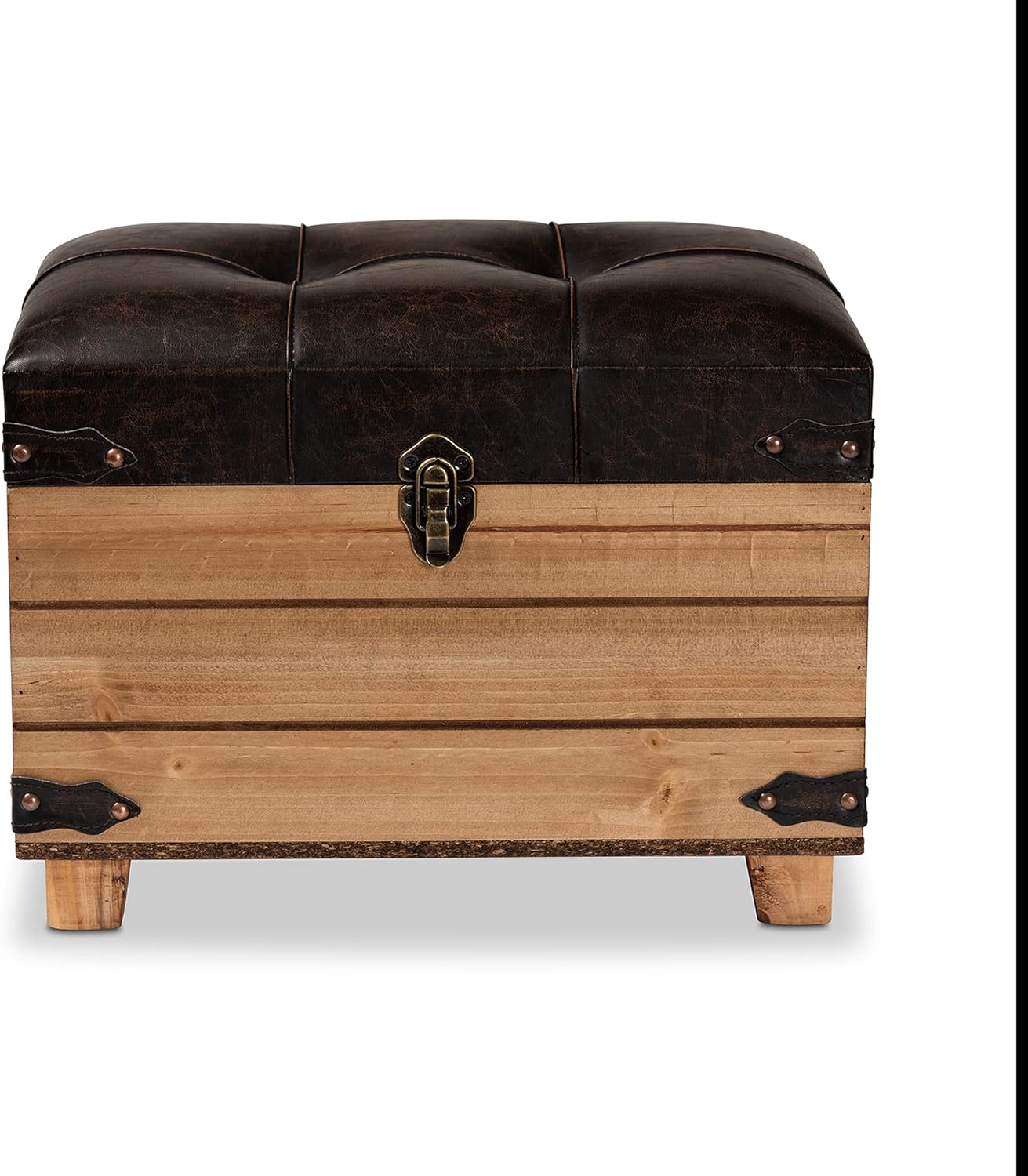The Edmund storage ottoman solves your storage needs with a rustic yet handy design. Made in China, this ottoman is comprised of a sturdy wood frame featuring an oak brown finish that lends a rustic feel. Its button tufted cushion is padded with plush foam and upholstered in smooth faux leather, creating a cozy footstool or extra seat when needed. Fully assembled, the top of the Edmund opens to reveal ample storage space for extra blankets, pillows, and more. Antique brass finished metal handles and a latch add a vintage touch, making the Edmund ottoman a fantastic addition to any space.
