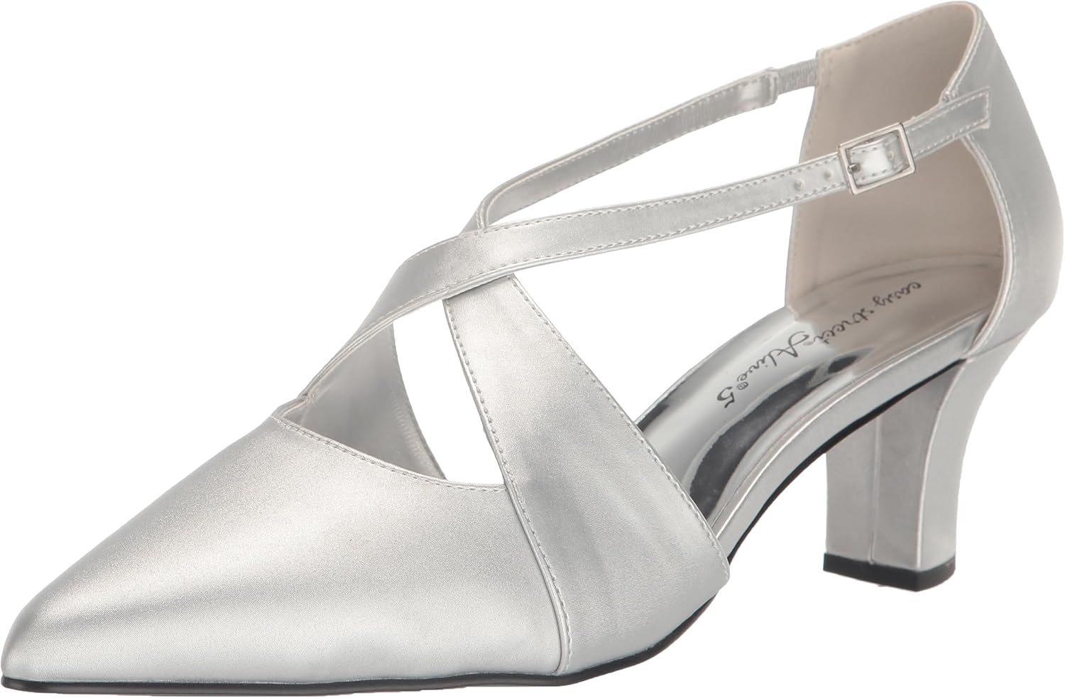 Add sophistication to your look with the Elegance by Easy Street. The criss cross upper design, enhances its dress heel and tapered toe. Comfort features include inside goring and an adjustable buckle a custom fit, padded insole and a flexible outsole for effortless wear.