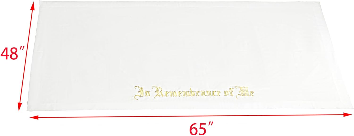 Tablecloth dimensions: 67" x 50". Fits tables approximately 45" L x 28" D x 29" H. Material: High-quality 7 oz (200 gsm) pure cotton fabric in white. Care: Machine washable. Use cold water, avoid bleach. Iron at moderate temperature. Holy Communion: Features elegant gold embroidery with "This Do In Remembrance Of Me". Usage: Ideal for creating a reverent worship atmosphere. Pairing: Recommended for use with our Holy Communion Table (item 11464, 10033-3). Instructional Video: Watch at Video Link or search "15776 holy communion table cloth cover 66x49 inches rectangular fixturedisplays" on YouTube.
