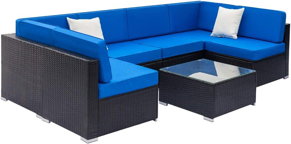 This seven-piece rattan sectional set brings the comforts of your living room to your backyard. Everything is there: two corner sofa sections, four stand-alone couch sections, and a coffee table. Enjoy the perks of home, like throw pillows and thickly padded cushions in the great outdoors. Easy to rearrange and capable of customizing to your occasion, it offers a versatile seating solution for six persons.