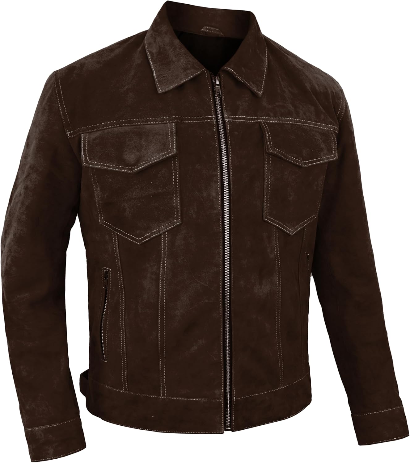 Men's Classic Western Style Genuine Suede Trucker JacketThis Suede Trucker Leather is designed for both comfort and style. Made from premium, soft suede leather, this jacket offers a luxurious texture and excellent durability for daily wear. The classic western-inspired design features a full zip front closure, multiple spacious pockets, and adjustable waist tabs for the perfect fit. Whether you're dressing up for a casual day out or layering for cooler evenings, this jacket adds a sophisticated edge to any outfit. Ideal for spring, autumn, or mild winter climates, it pairs effortlessly with jeans, chinos, or tailored trousers.Jacket Features:Suede LeatherPremium StitchingPointed Collar2 Flap Chest Pockets & 2 Zipper Waist PocketsZipper Front ClosureSnap Tab Button CuffsViscose Inner Lining With 1 Inner PocketAvailable in 6 ColorsCare & Cleaning Instructions:Taking care of jacket is easy. Just keep it dry and avoid wearing it when there are chances of a rain. When storing, make sure to hang the jacket on a robust quality hanger inside your closet. To prevent this jacket from deteriorating, keep it away from conditions of high heat.These jackets for men don't need frequent washing. You can easily wipe clean the suede jacket using a damp piece of cloth. Avoid pouring water over a stain as it can damage the leather. If your jacket has become really dirty, it is advisable to send it for dry cleaning.