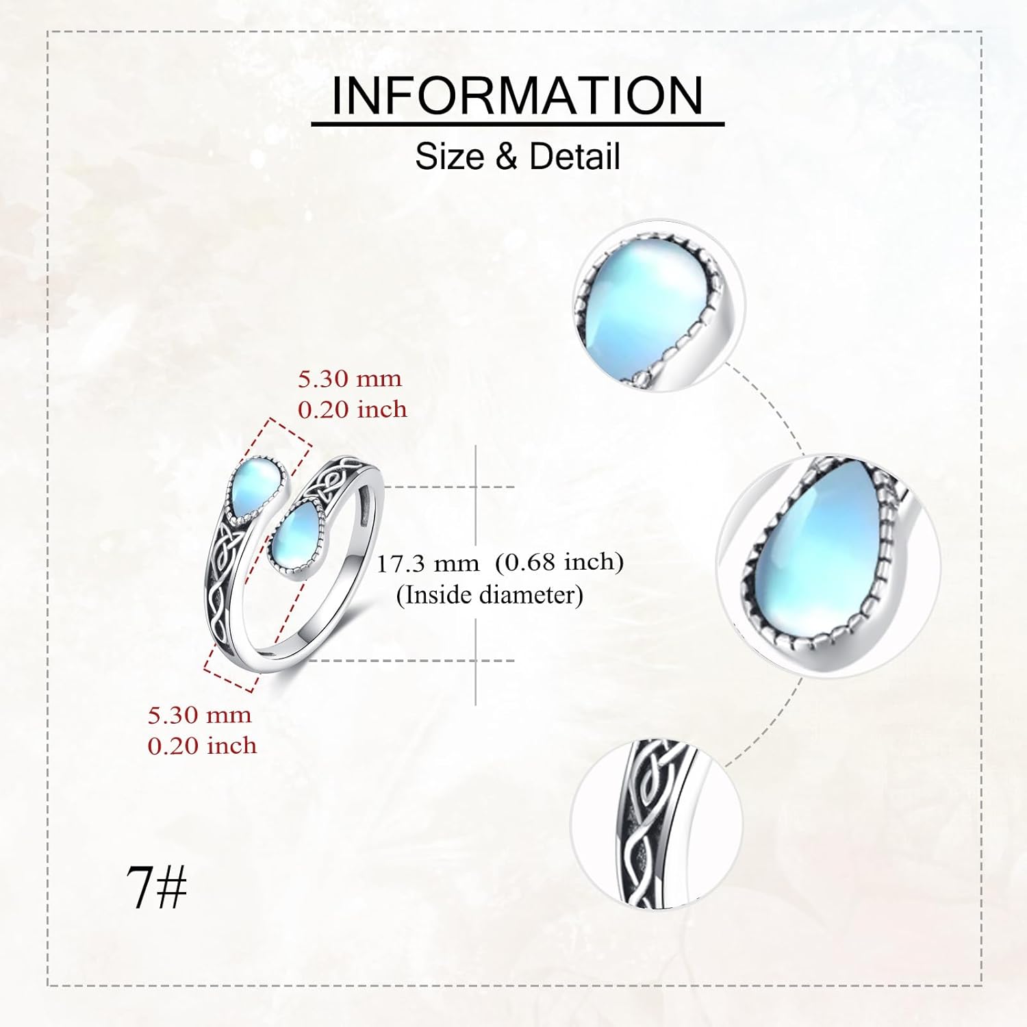 • Size:The initial setting of the moonstone ring is US 7, you can adjust the size of the ring according to the size of the finger within a certain range.Packaging:1 x moonstone ring; 1 x polishing cloth and 1 x exquisite jewelry box.