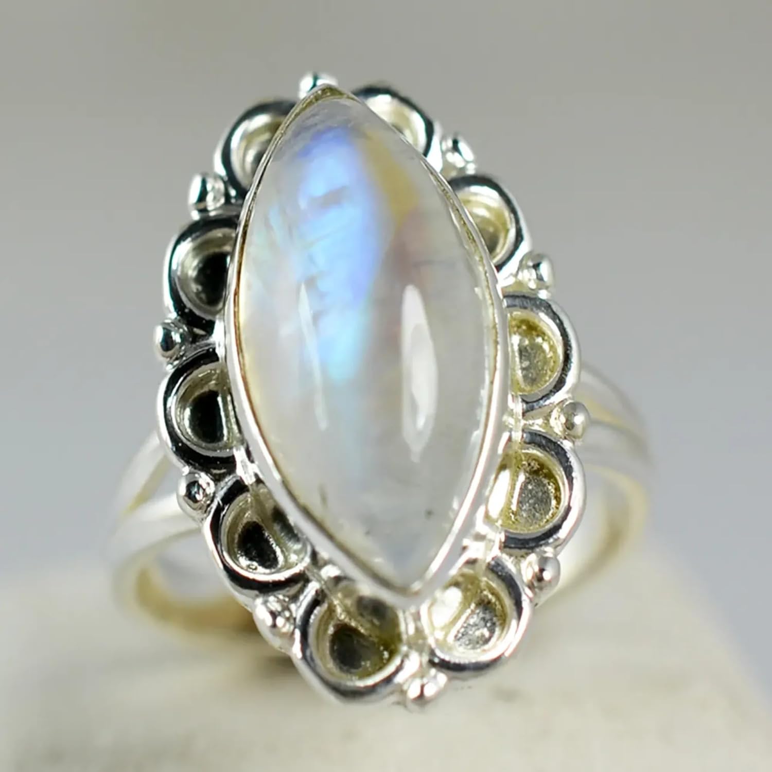 Discover the enchanting beauty of the Navya Craft Rainbow Moonstone Ring, a captivating piece of jewelry that brings together natural elegance and timeless craftsmanship. Made with high-quality 925 Sterling Silver, this handmade ring features a stunning marquise-shaped Rainbow Moonstone, a gemstone known for its unique play of colors, shimmering in hues of blue, white, and sometimes even flashes of violet. As the birthstone for June, Rainbow Moonstone is believed to enhance intuition, creativity, and emotional healing, making it an ideal gift for loved ones. Whether it’s for a birthday, anniversary, or a special occasion, this beautiful ring serves as a meaningful and thoughtful gesture. The ring’s marquise shape and delicate design exude boho-chic charm, perfect for women who love unique, standout jewelry. The high-quality 925 Sterling Silver band is not only durable and tarnish-resistant but also provides a comfortable fit that can be worn every day or on special occasions. With its mesmerizing gemstone and elegant design, the Navya Craft Rainbow Moonstone Ring is more than just a piece of jewelry—it’s a symbol of beauty, creativity, and the special moments you cherish. Make her day unforgettable with this stunning, one-of-a-kind gift.