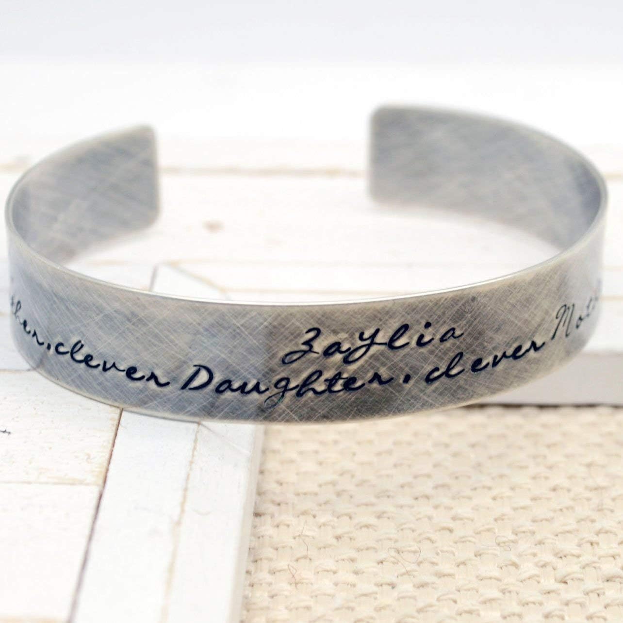 This beautiful cuff with rustic finish makes a perfect gift for both men and women. It can be engraved with the text of your choice - names, a phrase or even song lyrics. Personalization can be engraved on the inside or outside and has an oxidized and brushed finish. Included is a complimentary polishing cloth as well as an anti-tarnish re-closable storage bag to keep your piece looking beautiful for years to come.