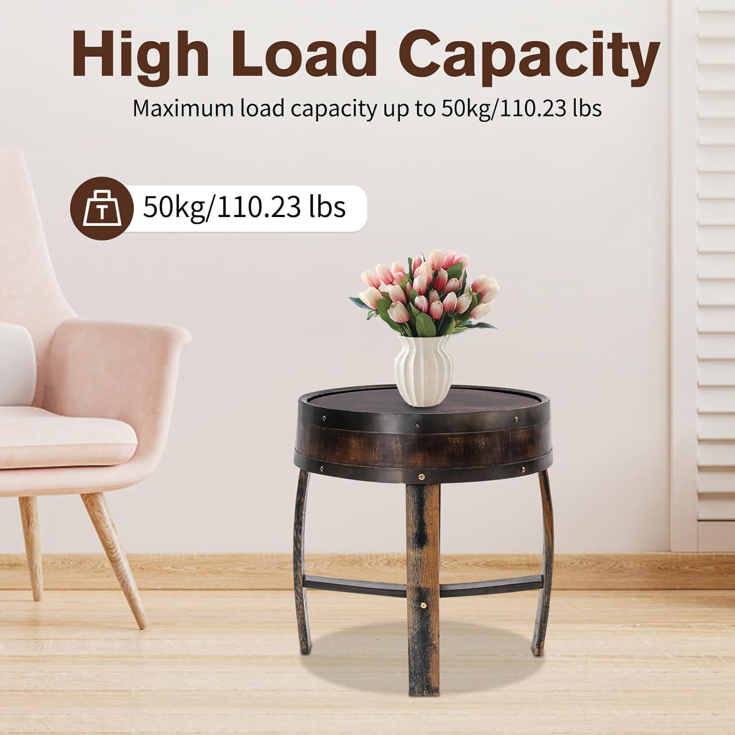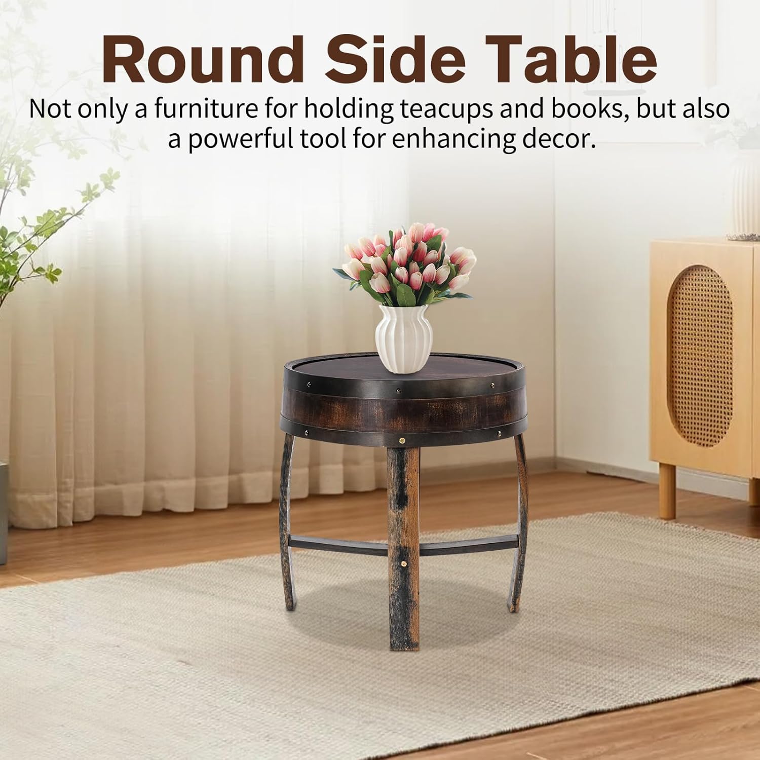 • 【Reinforced Load-bearing】This barrel end table features a robust structural design, reinforced crossbars, and thick panels, capable of withstanding a weight of up to 110.23 pounds. This whiskey barrel end table can easily carry items such as tea cups, making you feel at ease when using it, and adding a touch of composure and elegance to your living space.