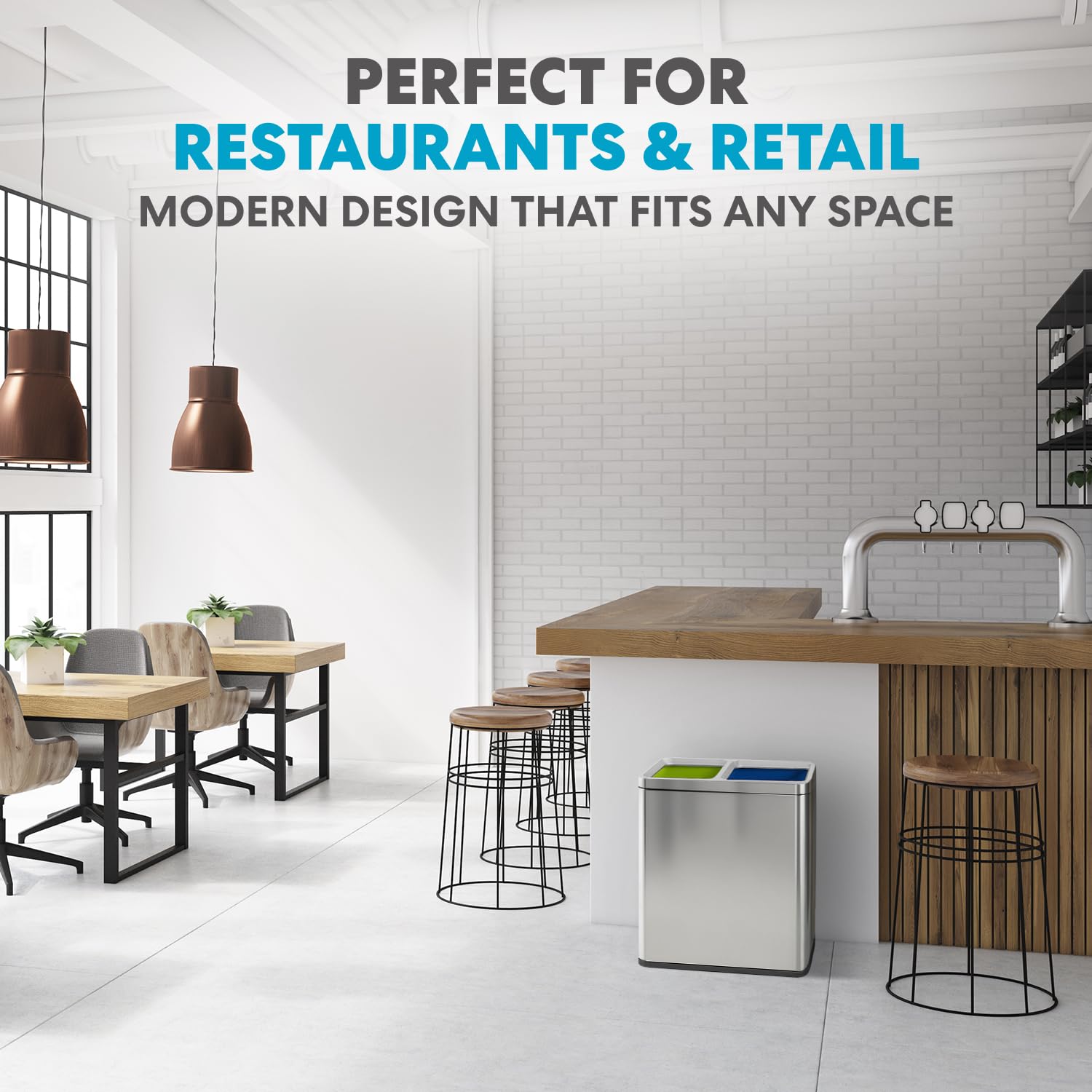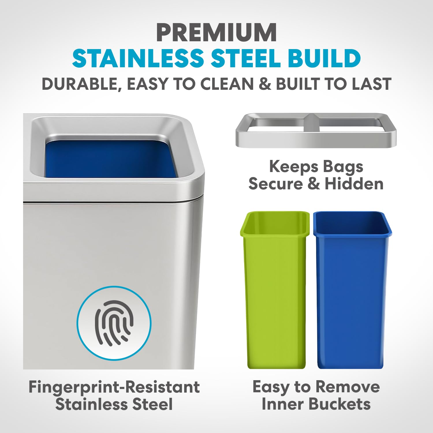 • HANDS-FREE USE: The stainless-steel open top stands up to daily use and removes the need to touch the lid during waste or recycling disposal to keep hands clean.