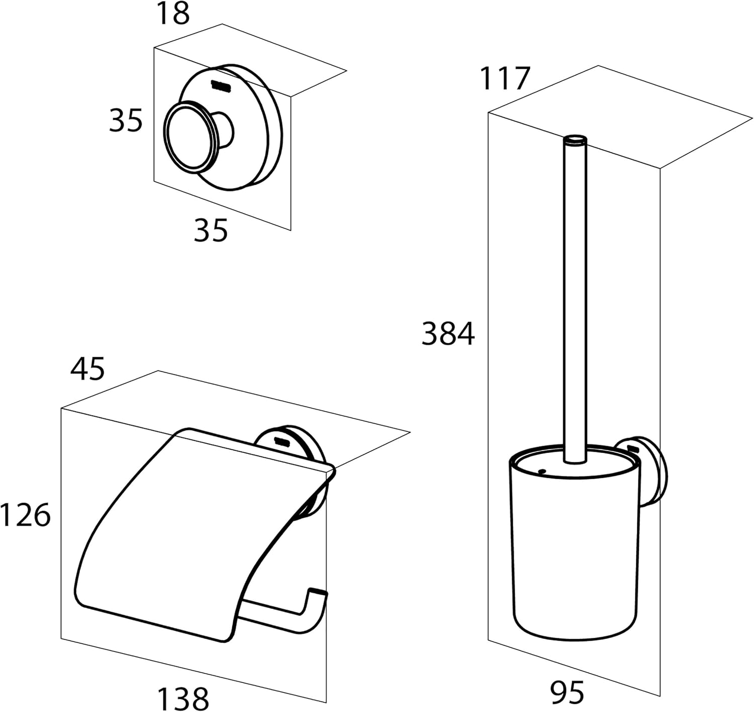 | Included Components | • Toilet brush and holder • Toilet roll holder with cover • Hook • 2x decor rings (1x light oak & 1x grey) • Fischer screws and plugs • Instruction leaflet |