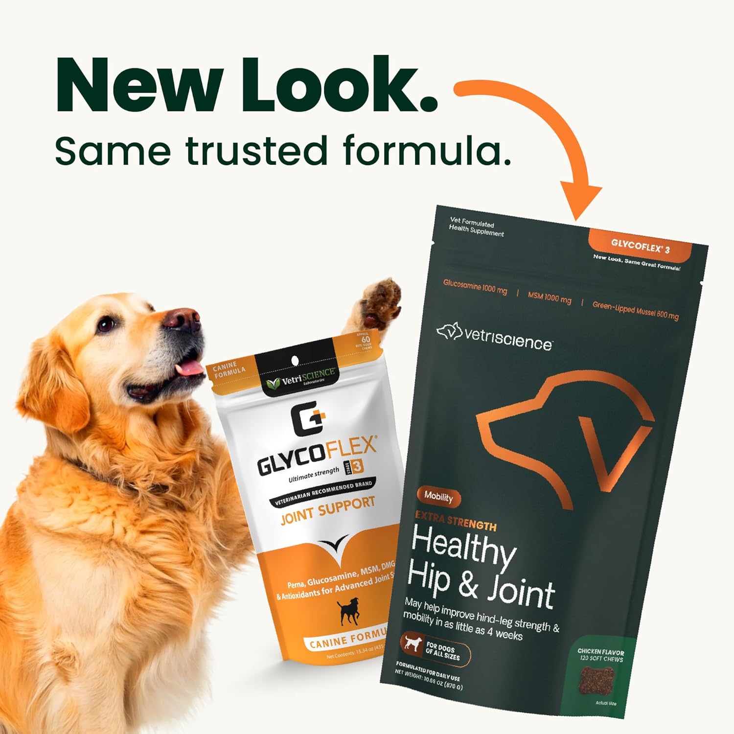 VetriScience® GlycoFlex® 3 Extra Strength Healthy Hip & Joint Chews represent Stage 3 of our comprehensive joint health program, formulated for dogs needing advanced support. This formula is recommended by veterinarians for geriatric dogs, working breeds, and as follow-up care after orthopedic surgery. Clinical research shows GlycoFlex 3 can increase hind-leg strength by up to 41% in just 4 weeks, making it one of the most trusted solutions for canine joint care. Each two-chew serving delivers 10 powerful active ingredients: 1000 mg glucosamine HCl (shrimp & crab), 1000 mg MSM, 600 mg GlycOmega™ brand Perna canaliculus (green-lipped mussel), 100 mg DMG, 50 IU Vitamin E, 24 mg Vitamin C, 10 mg manganese, 5 mg grape seed extract, 2 mg L-glutathione, and 0.002 mg selenium. Together, they support cartilage resilience, connective tissue strength, joint lubrication, collagen production, and oxidative balance. Unlike mussel powders or extracts, GlycOmega™ Perna utilizes the entire organism, preserving natural fatty acids and bioactives for superior results. Antioxidants (C, E, grape seed extract, selenium, glutathione) further promote immune health, detoxification, and a healthy inflammatory response. These bite-sized chicken-liver flavored chews are highly palatable, turning daily dosing into treat time. Manufactured in the USA in an FDA-registered, SQF-certified facility and carrying the NASC seal, GlycoFlex 3 guarantees clean, safe, and effective joint support with no artificial colors or fillers. Feeding directions are simple: initial 4–6 weeks: up to 30 lbs = 1 chew daily; 31–60 lbs = 2 chews daily; 61–100 lbs = 4 chews daily; 101+ lbs = 5 chews daily. Maintenance: reduce to 1 chew every other day for smaller dogs, or 1–3 chews daily depending on weight. With over 40 years of VetriScience expertise and 15,000+ veterinarians recommending our products, GlycoFlex 3 delivers clinically proven, veterinarian-trusted results—keeping your dog comfortable, mobile, and active year-round.